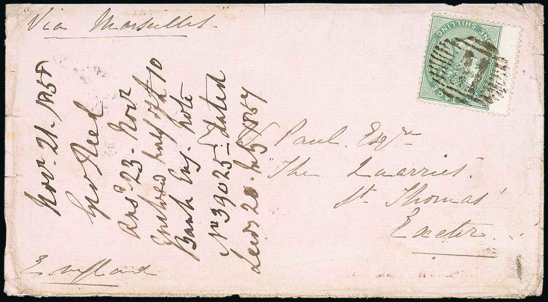 1858 (19 Nov.) pale pink envelope "Via Marseilles" to London, bearing wing-margin 1/- green placed inverted and cancelled with a fine strike, despatch, London and Exeter (13.11) datestamps on reverse; flap missing and other small imperfections though a rare double rate cover. S.G. Z22. Photo
