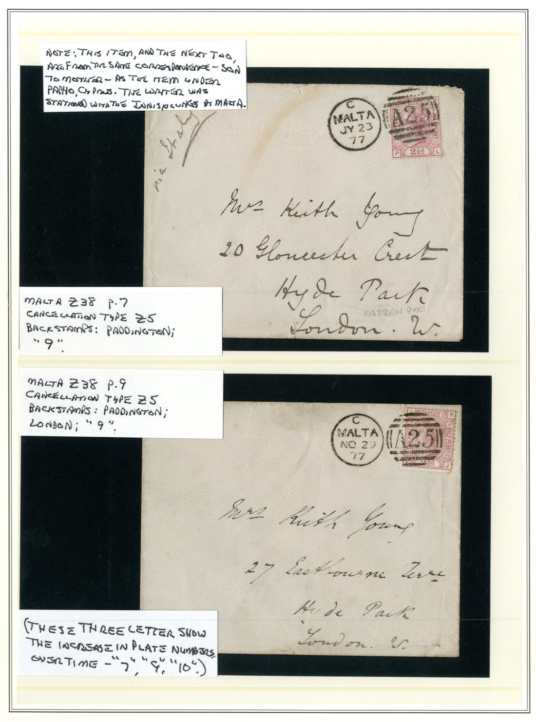 1860 entire to Amsterdam bearing 2d. blue and 4d. rose twice cancelled with horizontal duplex, 1878 envelope (soiled) "Via Brindisi" to London bearing 1d. Plate 193 (3, one defective) and 1877 envelopes (3) ex the Young correspondence "via Italy" to London, each bearing 2½d. (Plates 7, 9 and 10), all with horizontal duplex