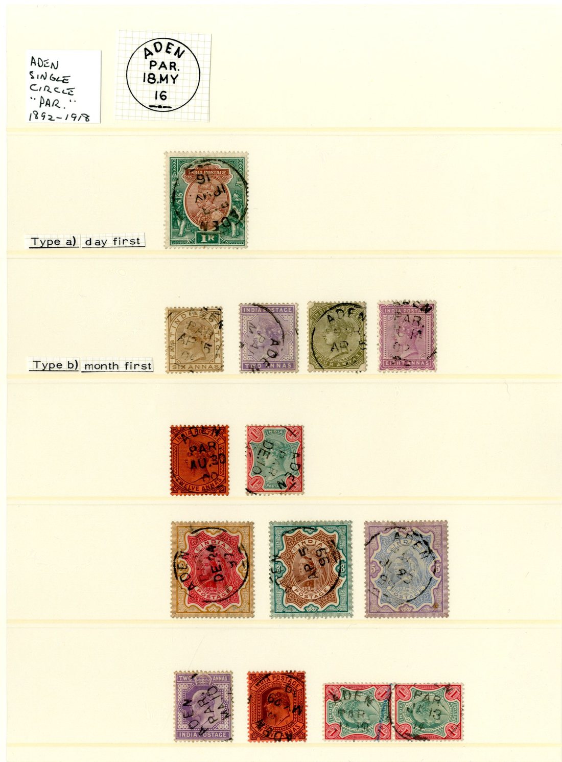 A collection of datestamps on a wide range of adhesives/pieces (133 items) including "B-22" and "B" duplexes on pieces, squared-circle datestamps, a range of single and double-ring datestamps with "par" and "reg" types, Aden Cantonment squared-circle, single and double-ring datestamps, and five on adhesives of G.B. and Somaliland