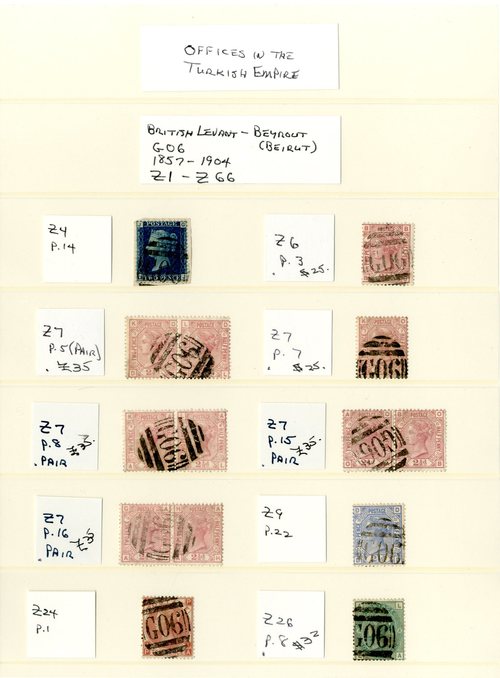 Beirut: 2d. Plate 14, 2½d. rosy mauve Plates 3, 5 pair, 7, 8 pair, 15 pair and 16 pair, 2½d. blue Plate 22, 10d. and 1/- Plate 8, all cancelled "G06" with that on the 10d. superb; also Smyrna 1d., 4d. Plate 13, 1/- Plate 13 and 1880 1d. all cancelled "F87", and three later values with datestamps
