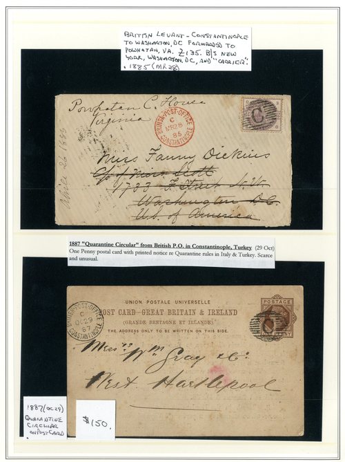 Constantinople: 1862 envelope to Scotland bearing 1862 1/- (small faults) neatly cancelled "C", unframed B.P.O. datestamp on reverse, 1883 envelope to U.S.A. bearing 2½d. blue Plate 23 and 1885 envelope to Washington and redirected to Virginia bearing 1883-84 2½d., both cancelled "C" and with B.P.O. datestamp in red alongside the adhesives, and 1887 1d. card (Quarantine Circular message on reverse) to England, cancelled "C" and with B.P.O. datestamp on face, all superb strikes