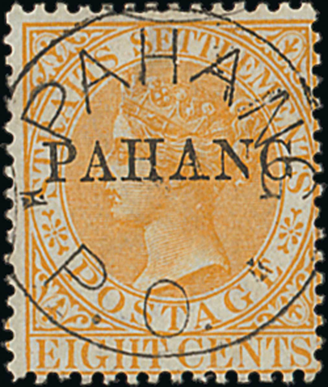 1889 (Jan.) 8c. orange cancelled by superb near-complete "pahang/p.o.". A very fine example of this rare stamp. B.P.A. Certificate (2005). Sc. 2; S.G. 2, £1,800. Photo