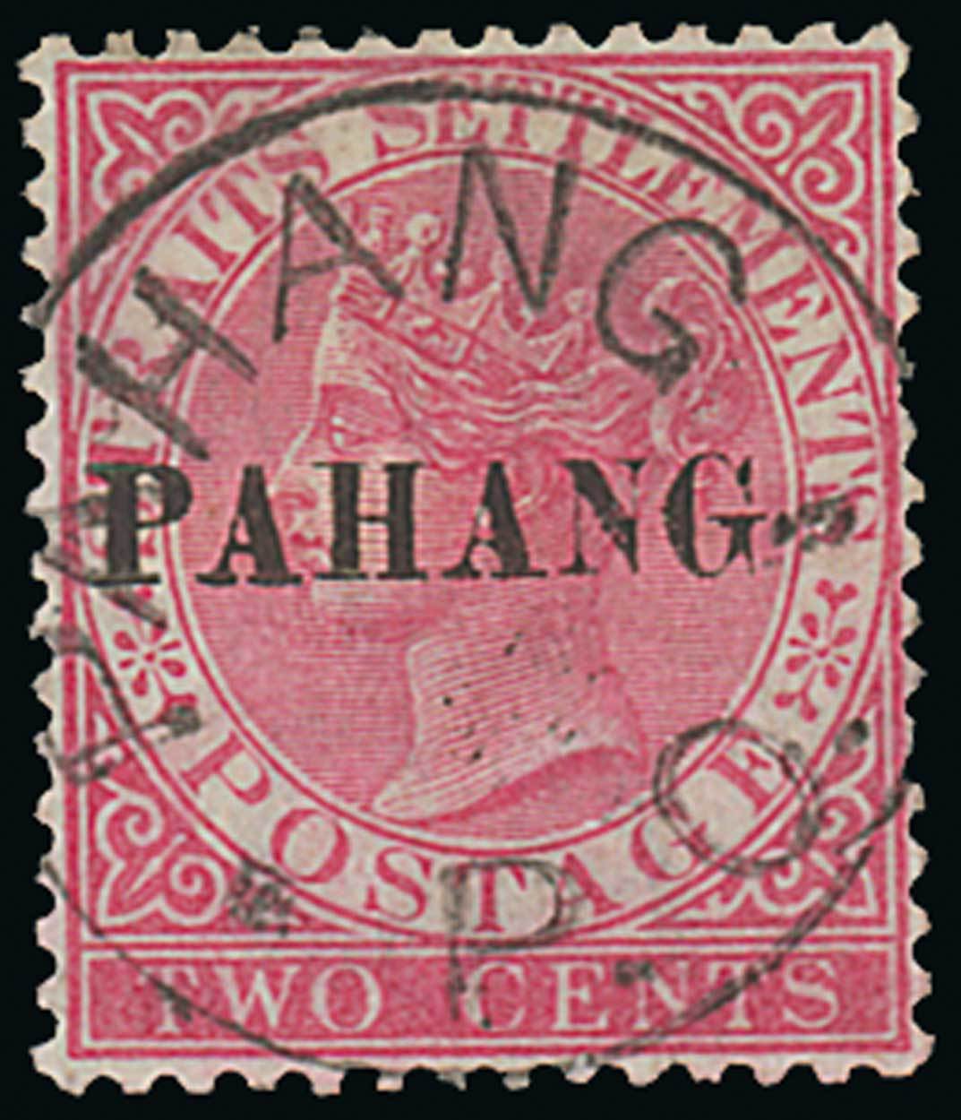 1890 (Feb.) 2c. rose "pahang" Type 3, neatly cancelled with near-complete "pahang/p.o."; colour suffused though a presentable example of this very rare stamp. B.P.A. Certificate (2005). Sc. 5; S.G. 5, £3,250. Photo