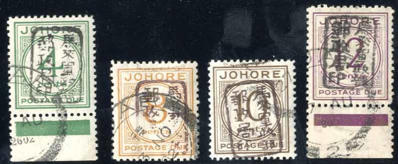 1942 (1 Apr.) single frame chop 4c., 8c., 10c. and 12c., the first and last marginal with black overprints, neatly cancelled with Muar datestamps. Sc. NJ2-5; S.G. JD2a, 3, 4, 5a, £365