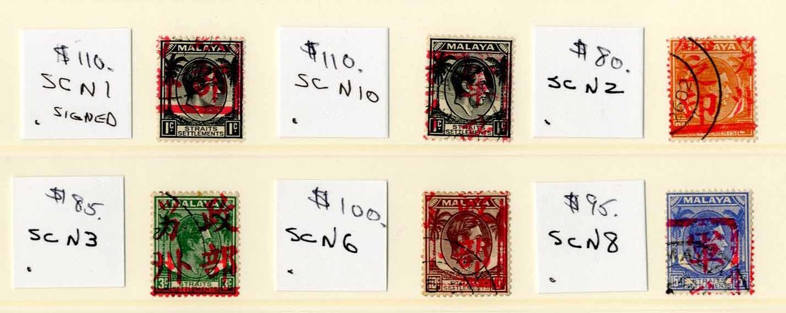 1942 (23 Apr.) stamps of Straits Settlements handstamped with large chop in red covering four stamps, 1c. (2), 2c., 3c., 10c. and 15c. neatly cancelled with double-ring datestamps; 3c. and 10c. a little toned, otherwise sound. Sc. N1-3, 6, 8; S.G. J45-47, 50, 52, £620