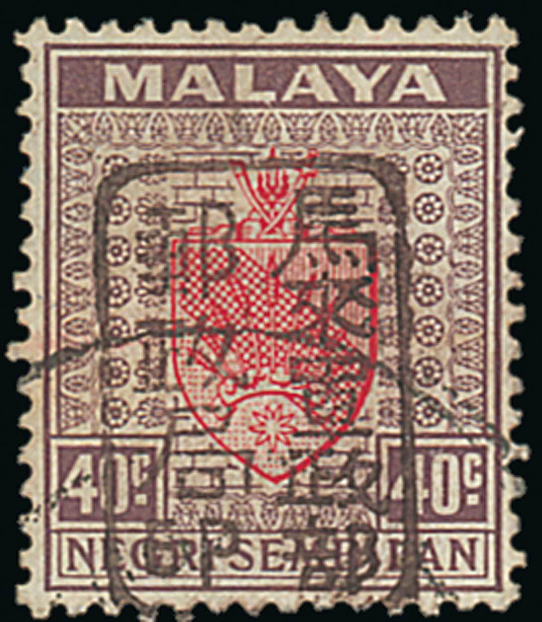 Negri Sembilan 1942 (Apr.) single-frame chop (Gallatly Chop H) in brown, 40c. scarlet and dull purple, neatly cancelled at foot; fine and rare. Signed Bloch. B.P.A. Certificate (2005). Sc. N14; S.G. 172a, £1,300. Photo