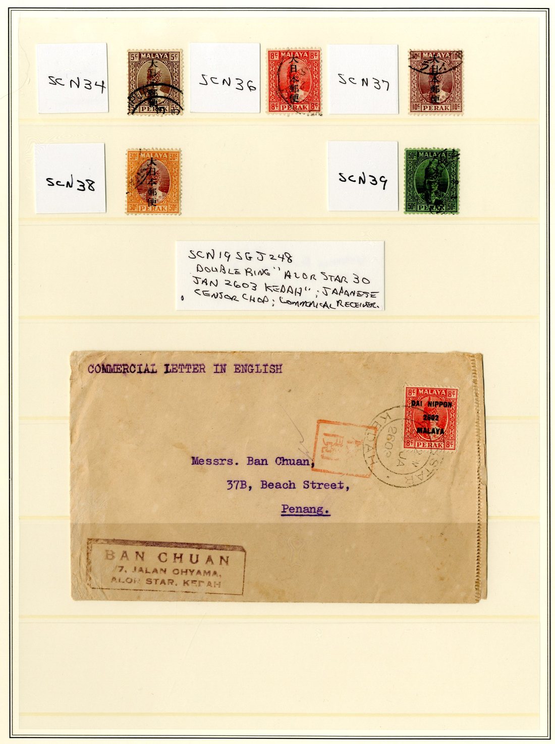 Perak 1942 (Apr.) single frame chop 1c., 5c., 10c., 25c. and 50c., 1942 (May) "dai nippon/2602/malaya" values (7) to $5 (on piece) with 6c. on censored envelope from Alor Star addressed locally, 1942 Dai Yubin values (8) to 50c. and 1942 (Nov.) surcharges (4)