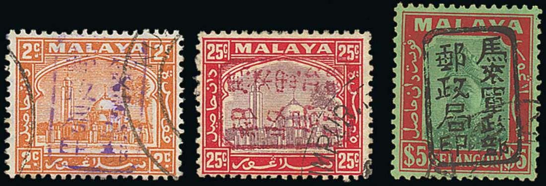 Selangor 1942 (Apr.) single frame chop 2c. with Gallatly Chop H in violet (B.P.A. Certificate, 2005), 5c., 8c., 10c., 25c. with chop in red, 30c., $2 and $5, 1942 (May) "dai nippon/2602/malaya" set of five with additional 40c., and 1942-44 Dai Yubin values (15) to $5; generally good to fine. Photo