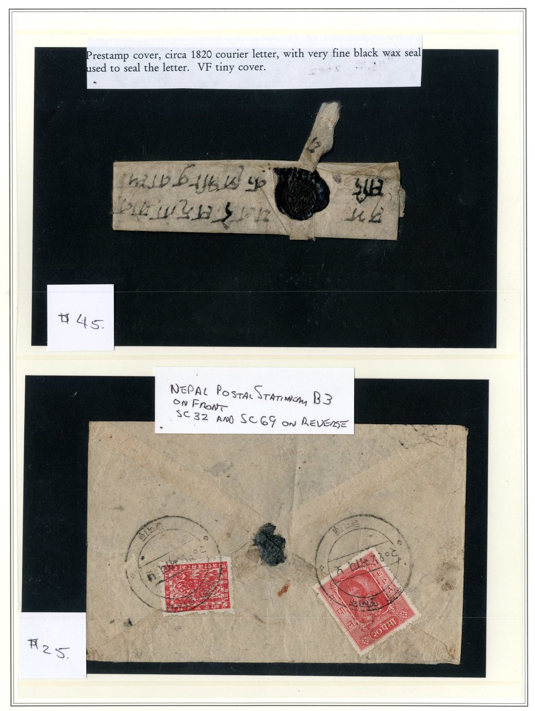 A collection (140) including 1820 (c.) small native entire letter with fine brown wax seal, 1881-1918 design values (26 with one 1a. blue unused), 1907-35 issue values (23), 1954 values to 2r., 1954 uprated stationery envelope, 1956 Coronation set, 1959 set and a few Officials; also India used in Nepal QV 1a., 2a., 12a., KEVII 2r. and KGVI 1r.; generally good to fine