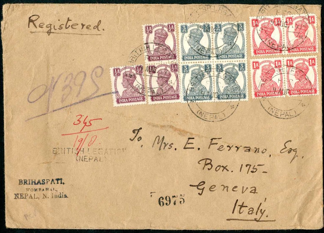 1947 (19 Aug.) envelope (192x135mm.) envelope registered from the British Legation to Italy, bearing 1940-43 3p. block of four, ½a. (3) and 1a. (4) neatly cancelled by Legation datestamps, "british legation/(nepal)" registration handstamp at left, arrival datestamp (29.9) on reverse