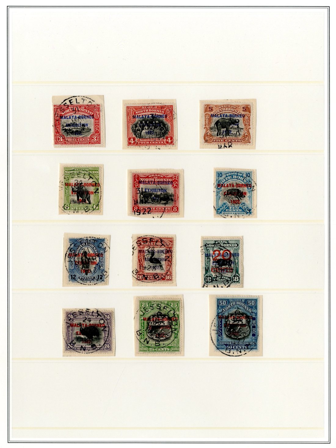 1922 (May) Malaya-Borneo Exhibition 3c. to 50c., all used on small pieces with Jesselton datestamps. Sc. 138a-153c; S.G. 256-275, £796