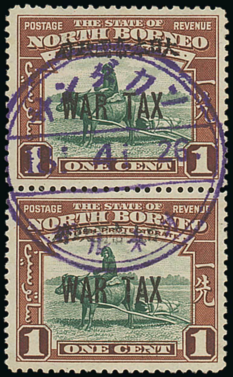 1942 (30 Sept.) War Tax 1c. green and brown vertical pair sharing neat datestamp in violet; a fine and scarce multiple. Brandon Certificate (1996). Sc. N15A; S.G. J16, £650. Photo