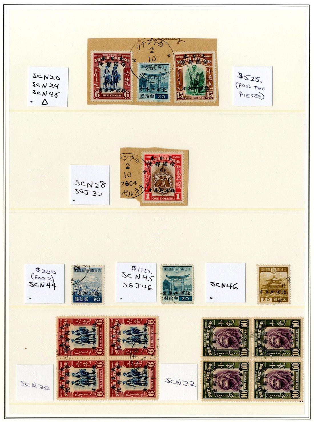 1944 (30 Sept.) range (73) with 1c. to 3c., 6c. to 25c. and $1 on pieces, and with additional 6c. (31) and 10c. (31), the additional values a little toned, and 1944-45 on Japan 20s., 30s. (2) and 50s.; the non-duplicates fine