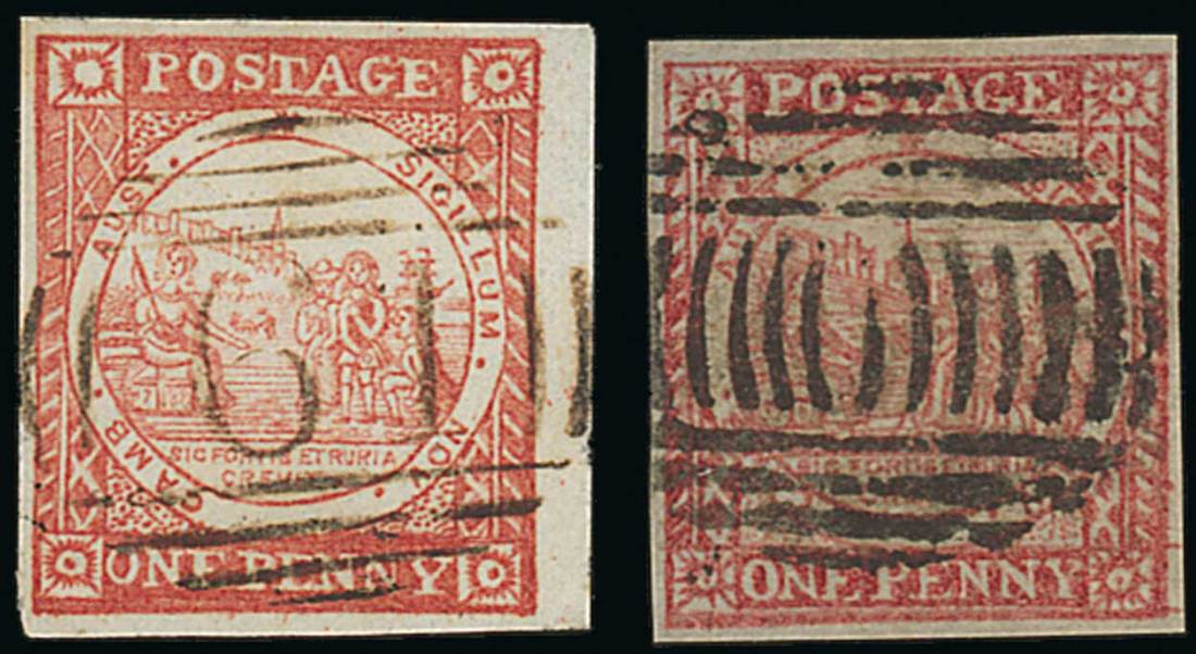 1d. Plate I on soft yellowish paper, reddish rose, [20] with no dot in upper left corner, good to very large margins and neatly cancelled "61" (Gresford) in brownish ink, and Plate II on greyish paper, dull carmine, [17] with good regular margins and cancelled with Sydney dumb obliterator. Sc. 1, 2c; S.G. 3, 11. Photo