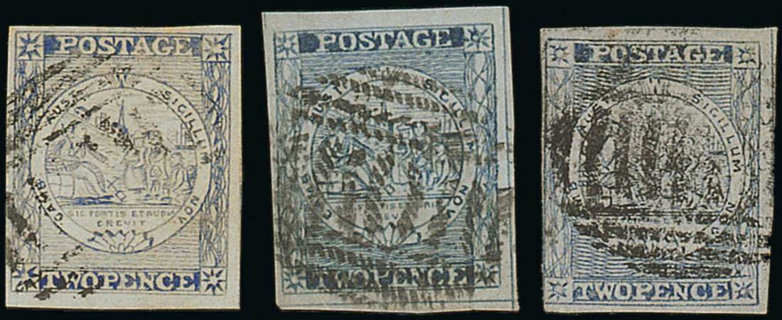 2d. Plate I worn impression, 2d. Plate I retouch, 2d. Plates II, III, IV and V, and 3d., all with just clear or good to large margins and variously cancelled; 2d. Plate II thinned though generally sound. Photo