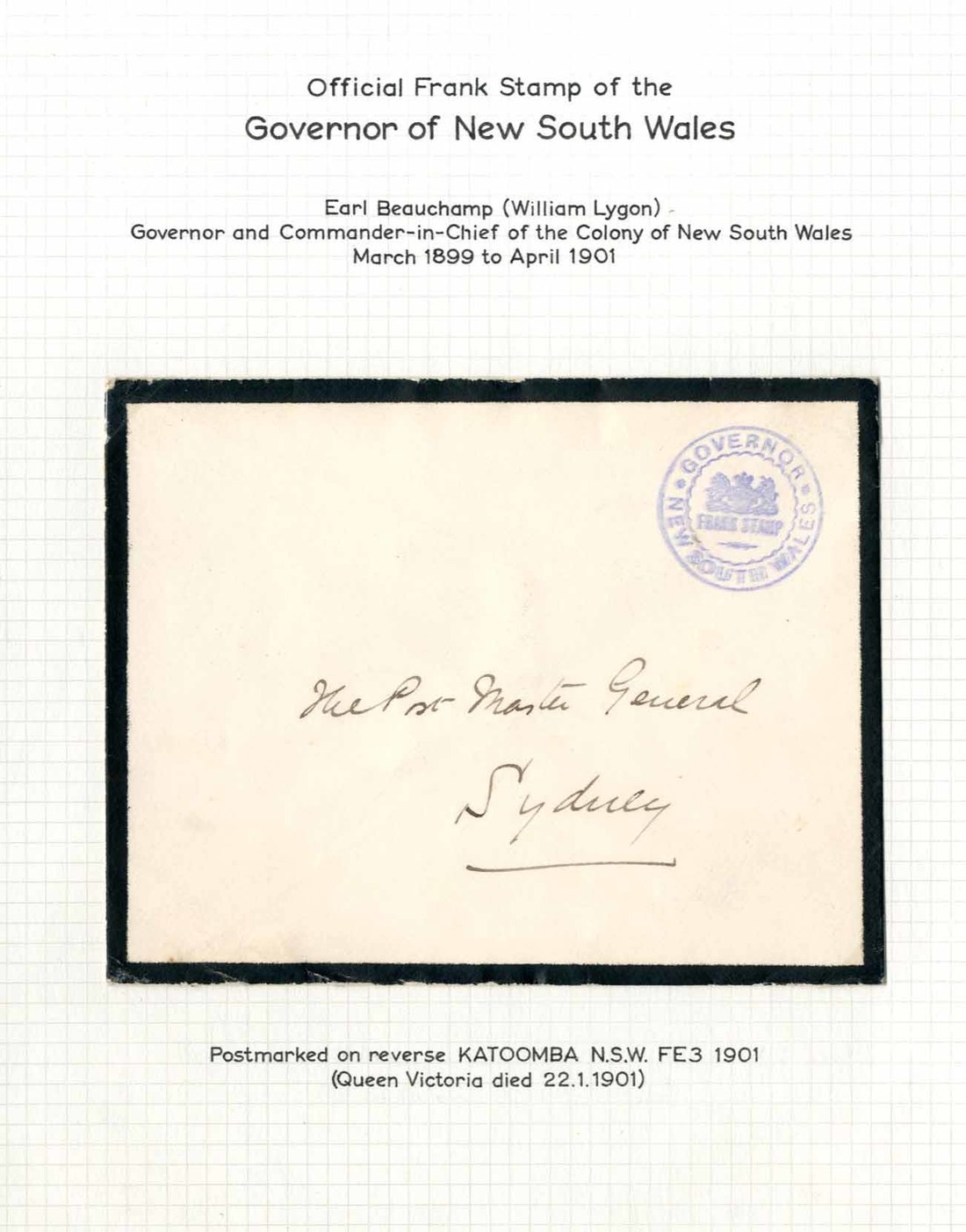 1896 envelope from Moss Vale to Sydney and 1900 envelope from Sydney to Bedfern, both showing Government House, Sydney Royal Arms imprint in red on flap, and 1901 (3 Feb.) mourning envelope from Katoomba to The Postmaster-General at Sydney, each showing a different type "governor/Royal Arms/frank stamp/new south wales" frank stamp in blue or violet; an attractive trio
