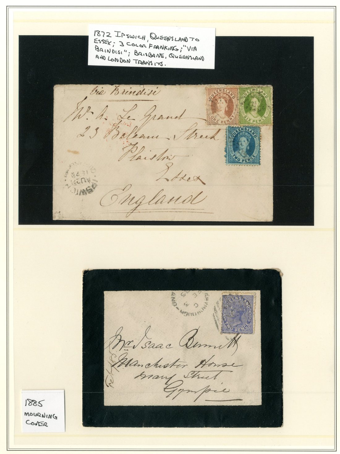 1872 envelope from Ipswich to England bearing 1d., 2d. and 6d. with light sunburst cancellations, despatch datestamp at left, 1885 mourning envelope from Maryborough to Gympie bearing 2d., 1890 envelope from Normanton to Scotland bearing 6d., 1901 envelope from Brisbane to New York bearing 2½d., 1905 envelope from Rockhampton to Tasmania bearing 2d. and undated ½d. green wrapper to Tenerife cancelled by "gpo" in bars