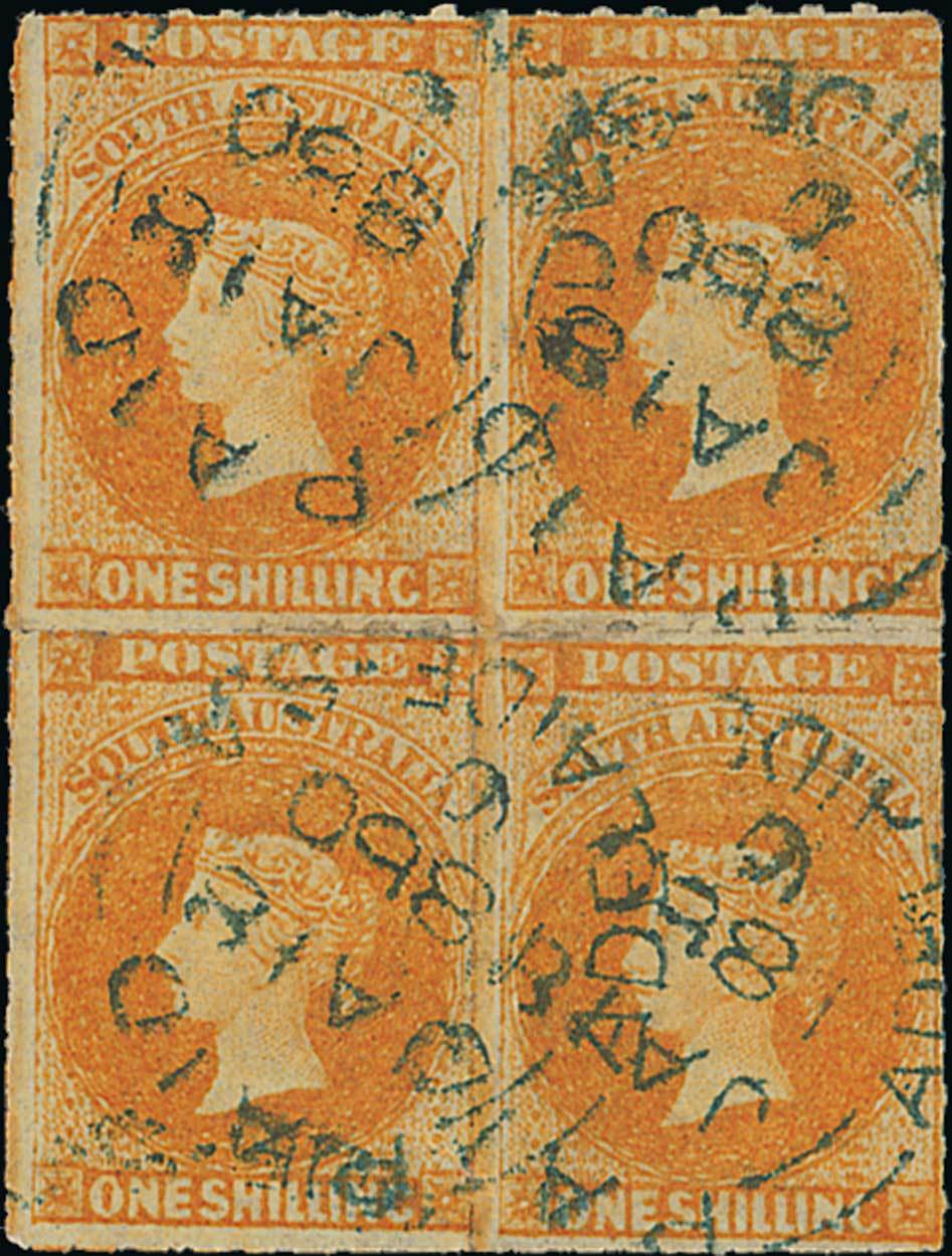 1858-59 rouletted 1/- orange block of four, each neatly cancelled by Adelaide 1860 datestamp in blue; a couple of small imperfections otherwise fine and a very rare multiple, believed to be the sole block of four recorded. Sc. 13; S.G. 18. Photo