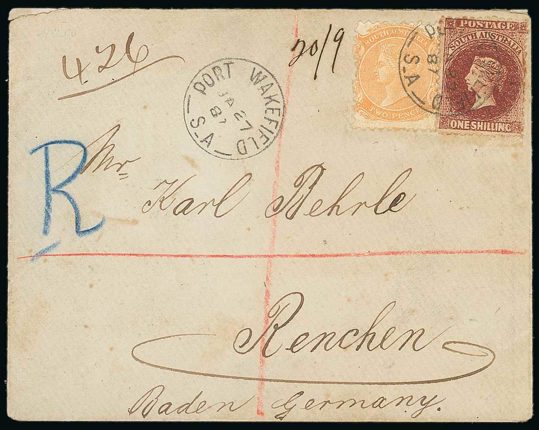 1887 envelope registered from Port Wakefield to Germany, bearing perf. 11½-12½ 1/- lake-brown in combination with De La Rue 2d. sharing datestamp with a further strike alongside, manuscript "R" in blue crayon at left, Adelaide and arrival (7.3) datestamps on reverse, and 1899 envelope from Angaston to New York and redirected to Shohola bearing ½d. pair and 1d. green (4) cancelled with squared-circle datestamps; also 1874 large piece from Adelaide to Aden bearing 2d., 6d. and 1/- and showing fine Aden Steamer Point datestamp. Photo for first