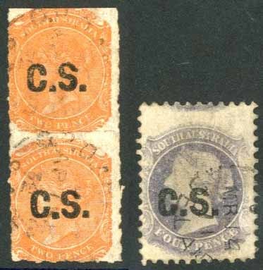 In black: Rouletted, watermark Star 2d. vertical pair, both with G.P.O. datestamps, and watermark Star, perf. 10 4d. "large" example with Adelaide datestamp. (S, S)