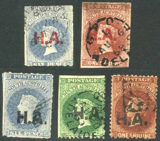 In red: Rouletted 6d. and 1/-, in black: rouletted 6d., and perf. 12 1d. (imperforate on two sides) and 1/-; generally good to fine. (2R, R, R, 2R, R)