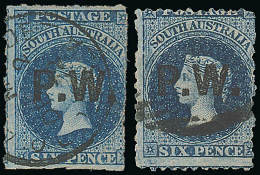 In black: Rouletted 6d. with 1872 datestamp; scarce, and perf. 12 6d. (two perfs. missing at left). (4R, 4R). Photo