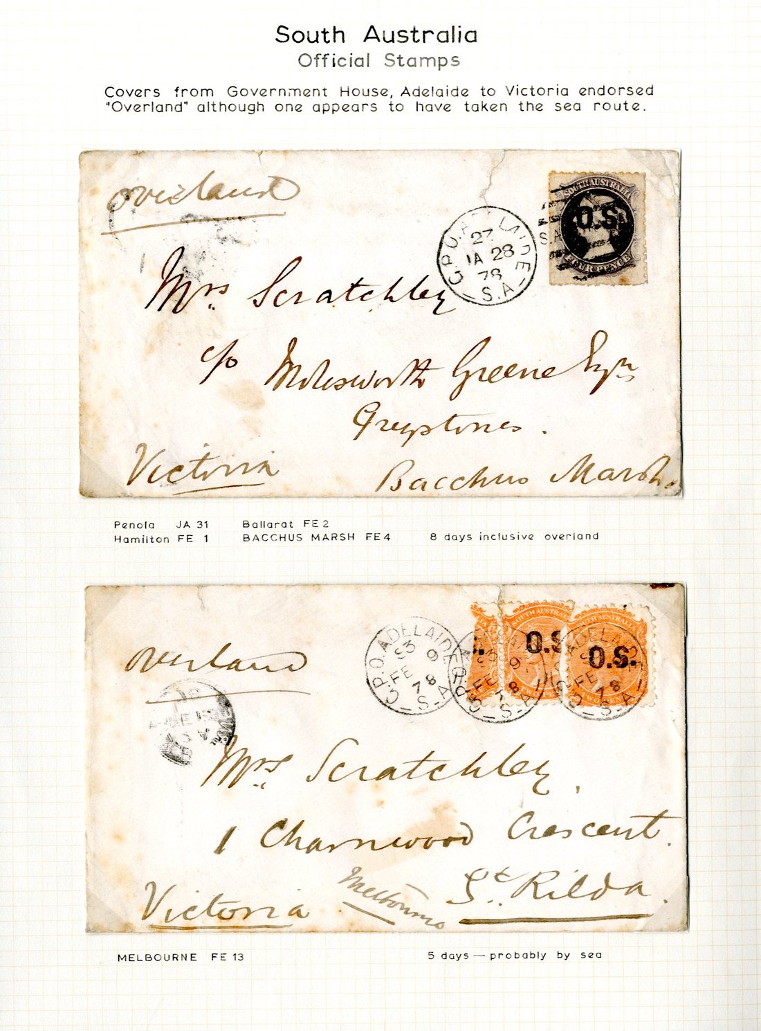 1878-1912 selection of covers (5) from Adelaide, comprising 1878 (Jan.) and (Feb.) ex the same correspondence to Victoria bearing 4d. or 2d. (2, one defective), 1880 addressed locally bearing 2d., 1902 double rate mourning type from the Post Office and Telegraph Dept. to Holland franked at 9d. and showing Correspondence Office c.d.s., 1912 from the Postmaster-General's Dept. registered to New York, franked at 5½d. with perfins and showing an early usage of the "all red" registration label, and one other