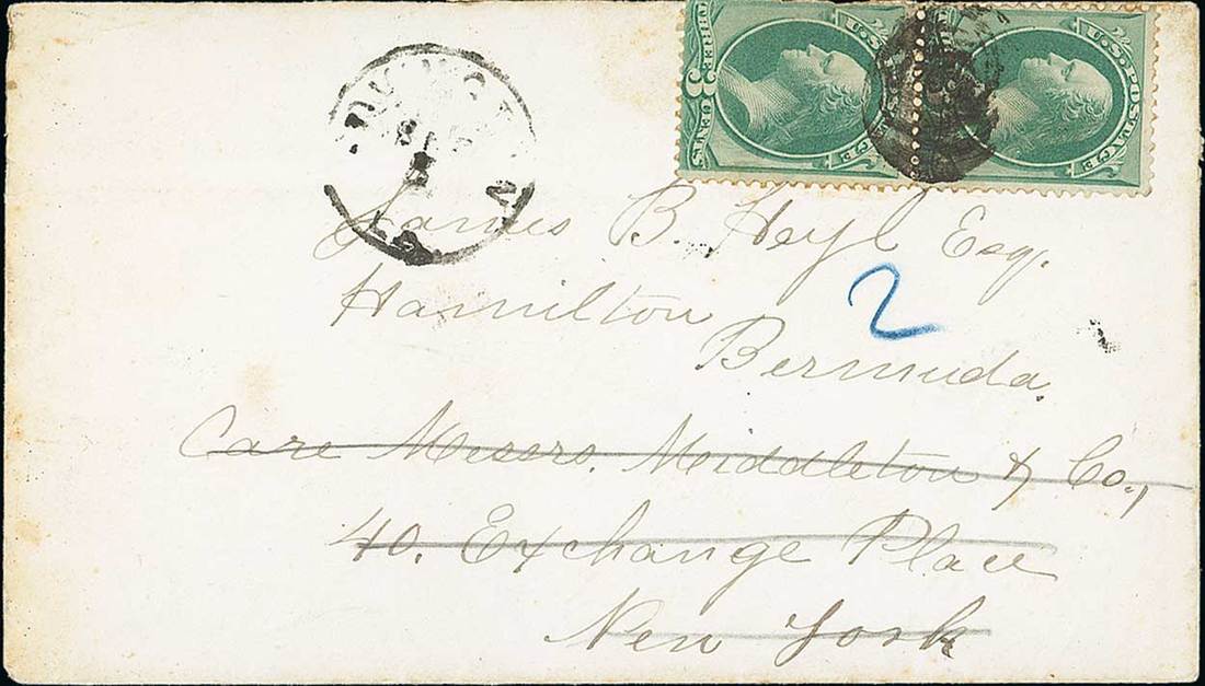 1873? (5 Sept.) double rate envelope from Covington, La, via Middleton & Co., New York, on the Eliza Barss to Bermuda, bearing 3c. green vertical pair (one with small faults at left) sharing double strike target obliterator and with despatch datestamp alongside, manuscript "2" ship fee in blue crayon below, fine "forwarded by/middleton & co./new york." cachet on reverse. A very rare double weight Convention cover. Also a photo of the vessel. Photo