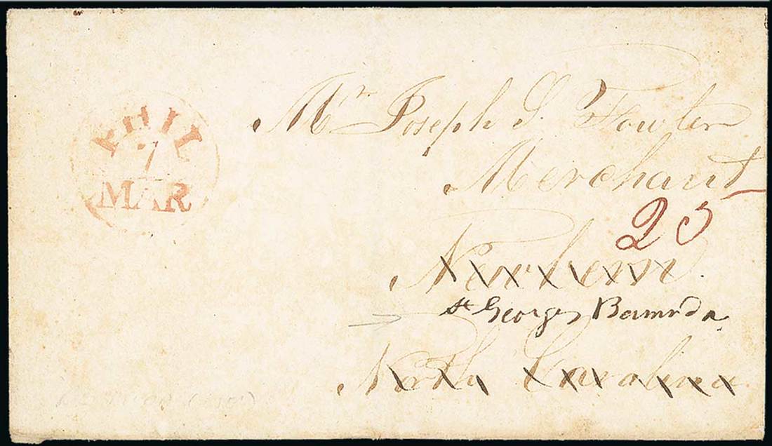 1820 (c.) entire from Philadelphia to New Bern, North Carolina and upon arrival marked on reverse "Forwarded by your Obedient Servant John Spencer West" being re-addressed to St. George's, showing despatch datestamp and manuscript "25" (internal postage for more than 400 miles) on face. Photo
