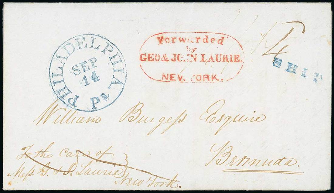 1841 (20 Aug.) entire letter from Turk's Islands "To the care of Messrs. G. & J. Laurie New York" and thence to William Burgess in Bermuda, rated "4d" and showing superb "ship" handstamp and Philadelphia datestamp, both in blue, and oval framed "Forwarded/by/geo & john laurie/new york" oval handstamp in red and with a further forwarding agents cachet on Godet & Barclay of New York (unrecorded by Rowe) on reverse; highly attractive. Photo