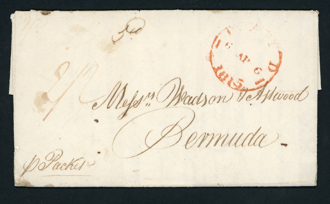 1815 (14 Mar.) entire letter from London, "p Packet" Princess Elizabeth (13.4) to Halifax and thence per H.M. Schooner via the Summer Route to Bermuda, rated "2/2" (2/11 currency) and "5d" internal charge and showing London Paid datestamp in red. A scarce cover carried on the first regular voyage after the War of 1812