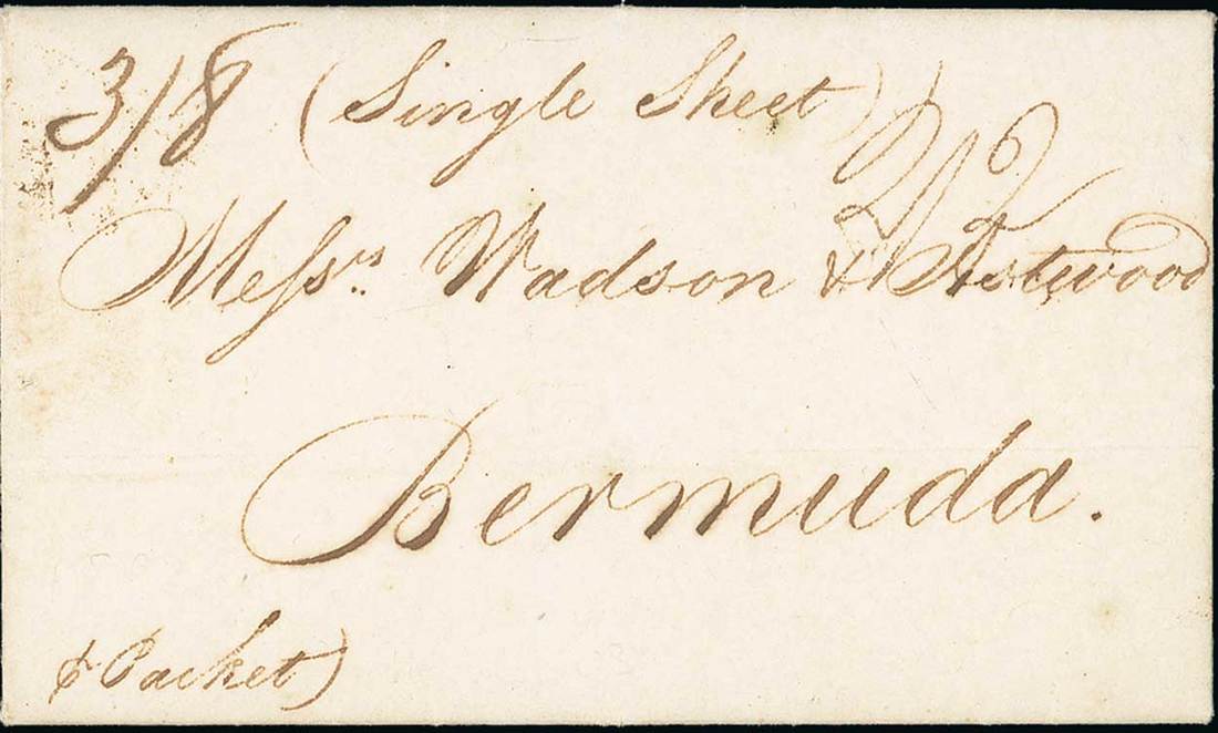 1823 (1 July) entire letter from London to Bermuda via the Summer Route after the Admiralty had assumed responsibility, marked p Packet" and carried by Lord Sidmouth to Halifax and thence per H.M. Sloop Argus to Bermuda, rated "2/22 and "3/8", despatch datestamp on reverse.. The first trip after the Admiralty took over the route from the G.P.O. and rare thus. Photo