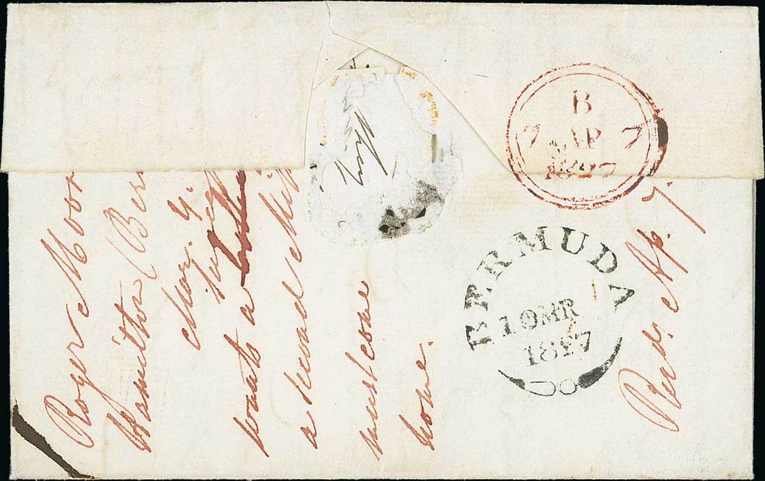Sub-route 5a: 1827 (10 Mar.) entire from Rev. Moore at Hamilton to London and carried on the earlier summer routing, rated "2/2" and showing, on reverse, "bermuda" fleuron datestamp (PM1) in black (very rare with only six examples recorded) alongside arrival datestamp (7.4). Fine and rare. Photo