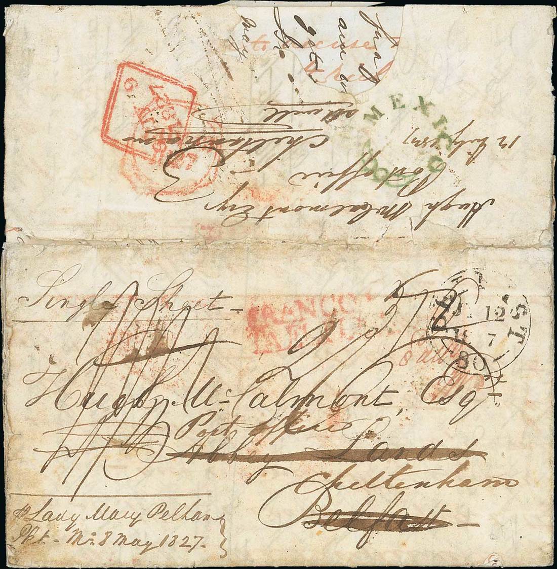 Sub-route 5b: 1827 (8 May) entire letter from Mexico City via Vera Cruz to Belfast and redirected to the Post Office at Cheltenham, endorsed "p Lady Mary Pelham" to Bermuda and thence Falmouth and Belfast, variously rated and showing "franco/ has/ta el puerto (Paid as far as Port) handstamp and Belfast datestamp (12.7) on face, the reverse with very fine "mexico" fleuron handstamp in green, applied at Falmouth, and two Irish datestamps; face panel folds largely separated, nevertheless full of character and the only known cover using this route with none originating in Bermuda. Photo