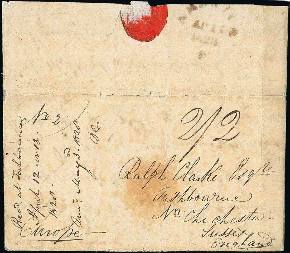 1828 (2 Mar.) entire letter from Bermuda to Fishbourne near Chichester per packet Skylark to Halifax, rated "2/2" and showing, on reverse, Falmouth "america/f" datestamp (11.4); splits at top of face panel and central tone mark though one of only two known strikes of the America F datestamp on mail from Bermuda. Photo