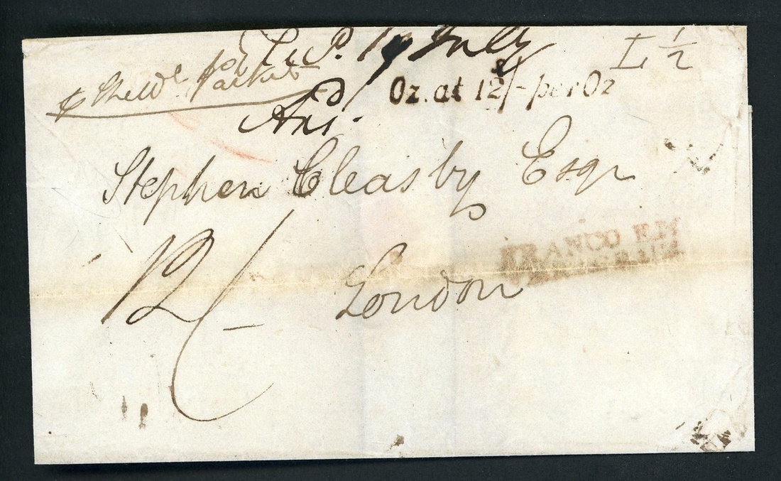 1828 (May) entire from Mexico City via Vera Cruz to London per Sheldrake, bypassing Jamaica and via Bermuda to Falmouth, marked "p the We packet and dated "12/-", showing light "franco en/vera cruz" handstamp crossed by filing crease and with "Oz. at 12/- per Oz" handstamp at top, arrival datestamp (19.7) on reverse