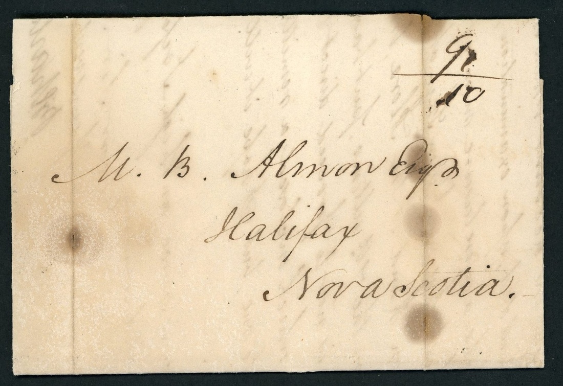 1829 (24 Apr.) double rate entire (stained filing creases) from Bermuda to Halifax per packet Rinaldo, rated "9" over "10" (4d. x2 + 1d. Nova Scotia local delivery = 9d.) and showing, on reverse across join, fair "bermuda" fleuron datestamp (PM2) with upper portion of date unclear