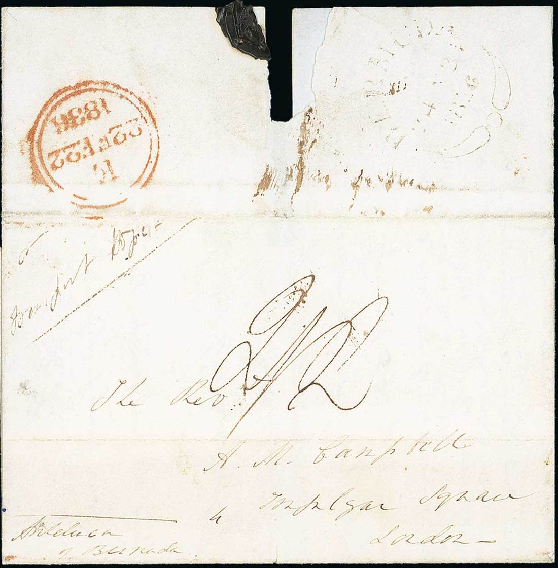 1836 (1 Jan.) entire from Bermuda to London direct by packet Hope (22.1) to Falmouth, rated "2/2" and showing, on reverse, a light strike of the "bermuda" fleuron datestamp (PM2) and arrival datestamp (22.2). A most unusual direct carriage from Bermuda to England and believed to be the only example of mail carried this way. Photo