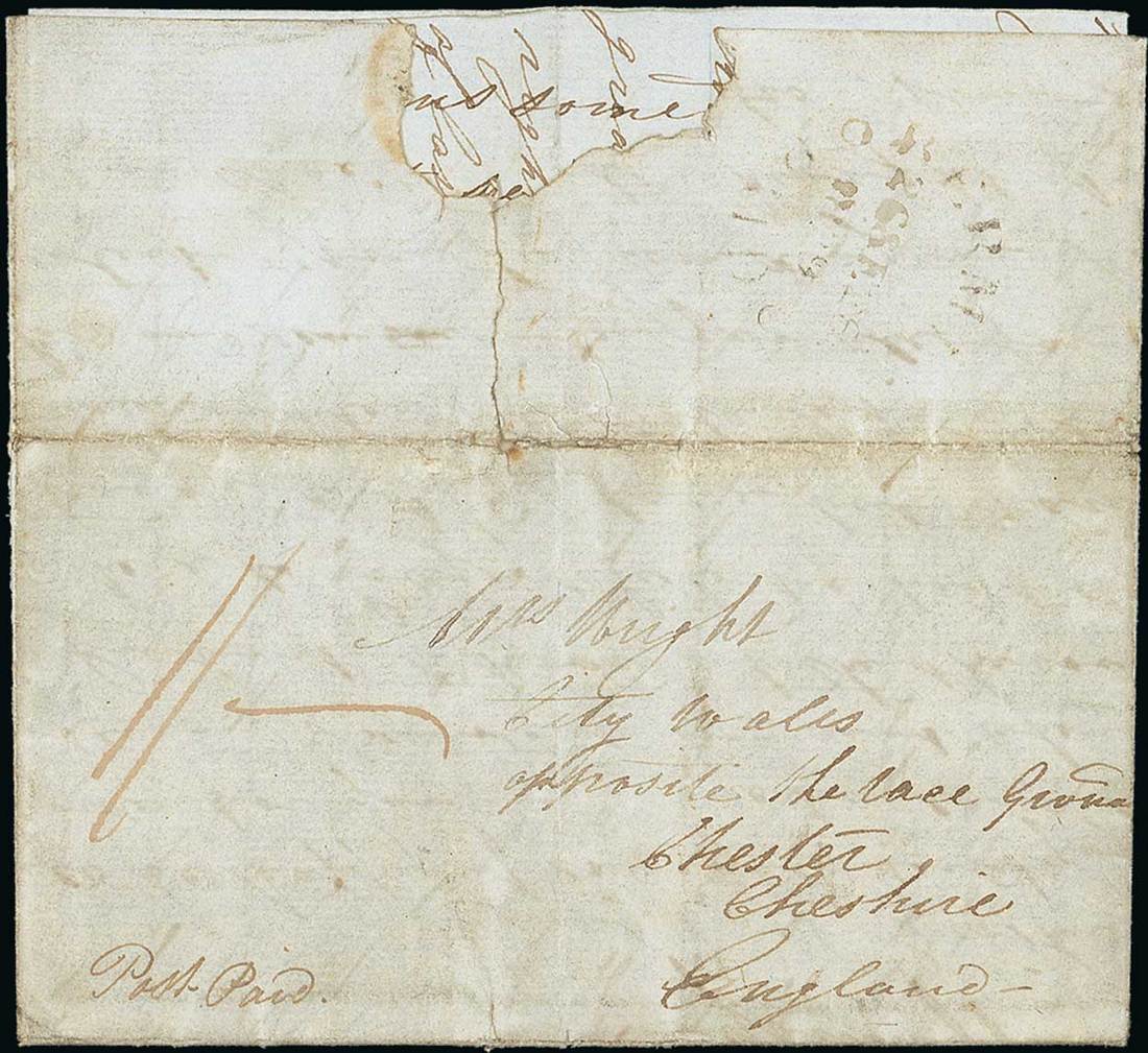 1839 (25 Sept.) entire letter "Post Paid" to London per Velocity to Halifax and per Star to Falmouth, rated "1/-" (the packet rate having been reduced from 2/2d. to 1/- on 4 March 1839) and showing, on reverse a light but legible strike of the very rare "bermuda/paid" datestamp (P1, one of only five recorded examples); a little soiled though the earliest known date of the 1/- rate from Bermuda and the earliest known date of use of the Bermuda P1 datestamp. Photo