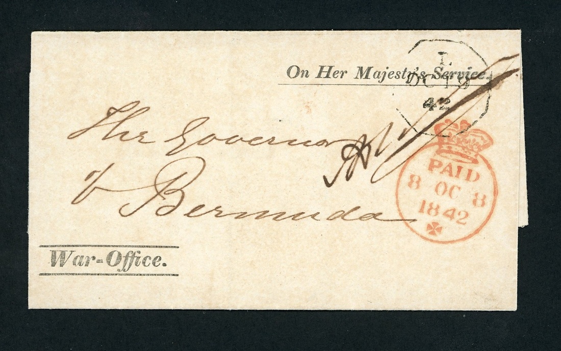 1842 (8 Oct.) OHMS War Office printed entire from London to the Governor of Bermuda, Major-General William Reid, from Liverpool per Cunard R.M.S. Caledonia to Halifax and per Lady Olga to Bermuda, showing Crowned Paid (8.10) and Liverpool (10.10) datestamps, the brief comments noted refer to letters on public service for any Department of the War Office being directed to the Secretary of War. Official mail to Bermuda at this time is scarce