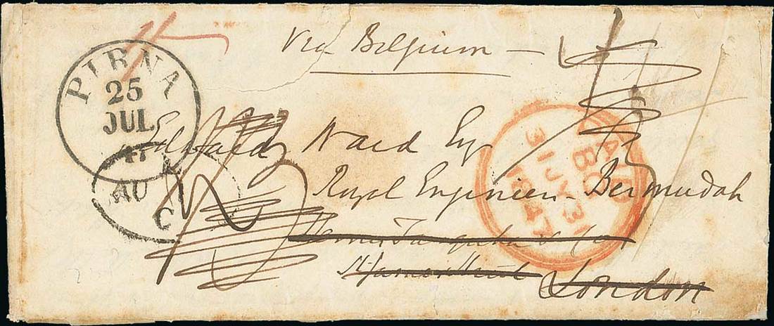 1844 (26 July) small entire letter from Pirna, Saxony "via Belgium" and London to Edward Ward of the Royal Engineers at Bermuda, from Liverpool per Cambria to Halifax and per Margaret to Bermuda, variously rated and showing despatch, London (31.7) and Liverpool (1.8) datestamps on face panel, a further London datestamp on reverse; tear on flap and on top of face panel, and minor edge faults though rare with few covers from Germany to Bermuda recorded. Photo