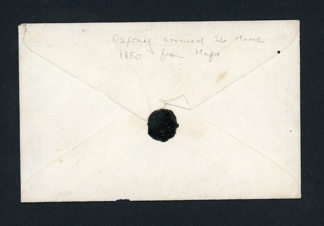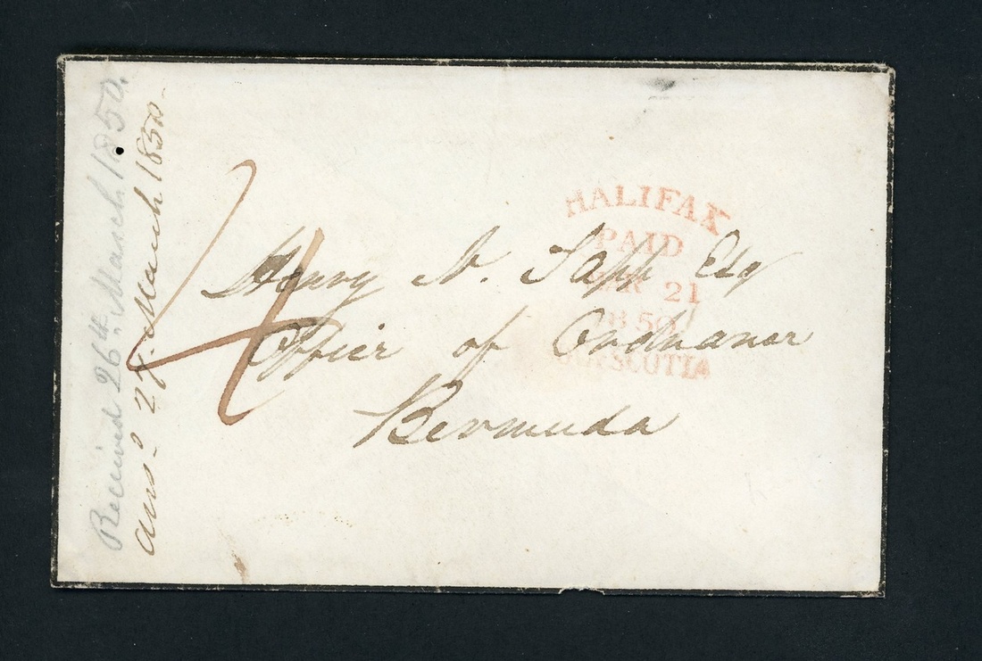 1850 (21 Mar.) mourning envelope from Halifax per Ospray to Bermuda, rated "4" and showing light "halifax/paid/nova scotia" datestamp on face