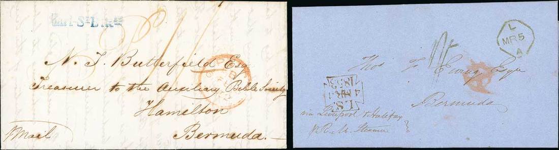 1852-53 range of covers (25) carried during the Levantine crisis, three from Bermuda (Hamilton, Ireland Island and St. George's) and twenty-two from England to Bermuda carried on a variety of Levantine or replacement sailings and including first successful trip of the Levantine, 2nd. trip, 3rd. trip (2), 4th. trip, 5th. trip (2, one from Newfoundland), 6th. trip, 12th. trip, 15th. trip, 16th. trip, and 18th. and last trip, these covers interspersed with thirteen replacement sailings. A remarkable holding of these covers fully demonstrating the unreliability of steam in the early days. Photo