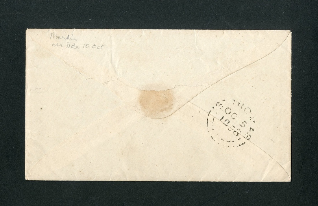 1858 (8 Oct.) envelope, complete with contents, from St. Thomas per Merlin to B. Wilson Higgs (a forwarding agent) at St. George's, Bermuda, rated "4" and showing St. Thomas double-arc datestamp on reverse