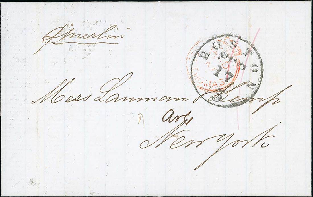 1862 (1 Sept.) entire letter from St. Thomas to New York, sent per Merlin to Bermuda and Halifax per Arabia to Boston and thence to New York, rated "1/-" and showing Crowned Circle "paid/at/st. thomas" overstruck with "boston/5" datestamp (17.9), despatch datestamp on reverse. Photo