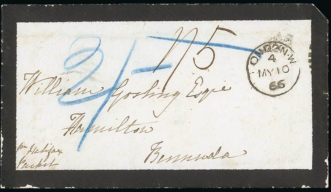1866 (10 May) mourning envelope from London "pr Halifax Packet" to Hamilton, per Cuba to Halifax and thence per Alpha to Bermuda, sent unpaid with despatch datestamp at upper right, initially charged a fine of double the deficiency "1/5" (11d. British share of postage + half the fine of 1/-), on arrival fully charged at "2/-" in blue crayon with Bermuda retaining 7d. (6d. fine + 1d. internal postage). Believed unique. Photo