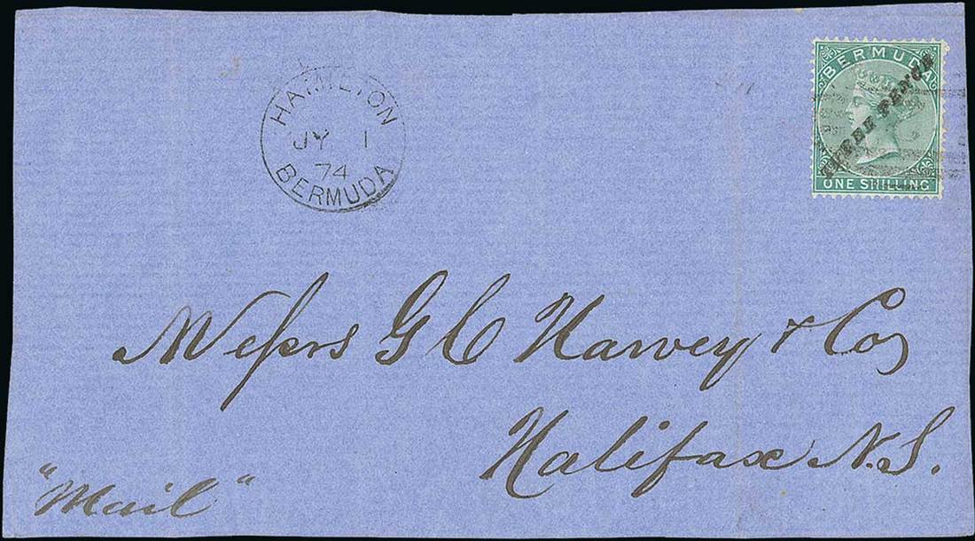 1874 (1 July) front from Hamilton per Delta to Messrs. Harvey & Co, at Halifax, bearing 1874 (Mar.) "three pence" in italic capitals with fancy "p" in "pence" on 1/- green S.G. 13b) cancelled "2" (K1) and with despatch datestamp (P5) at left. A rare usage of this scarce provisional surcharge, being one of only three examples recorded. Photo