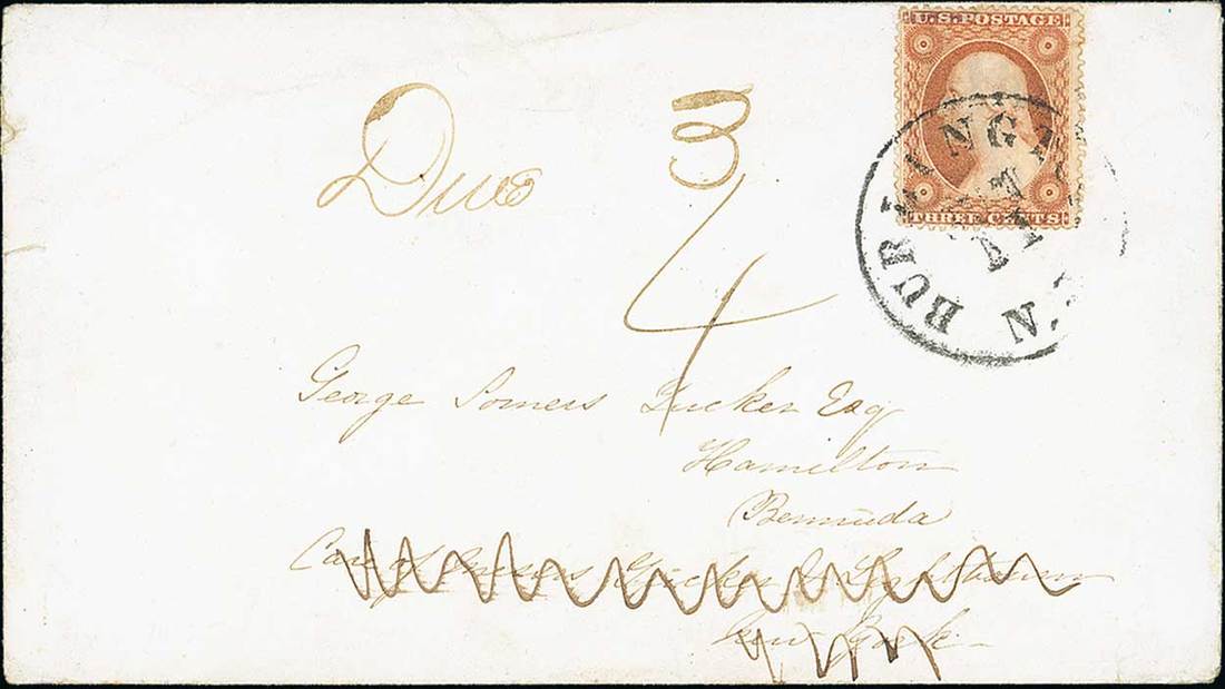 1858 (1 June) envelope from Burlington, New Jersey to George James Tucker "Care of Messrs. Tucker and Lightbourn, New York" (deleted), apparently addressed in the hand of William B. Perot and bearing 1857-61 3c. dull red cancelled by datestamp and with manuscript "Due 3" above "4". Photo