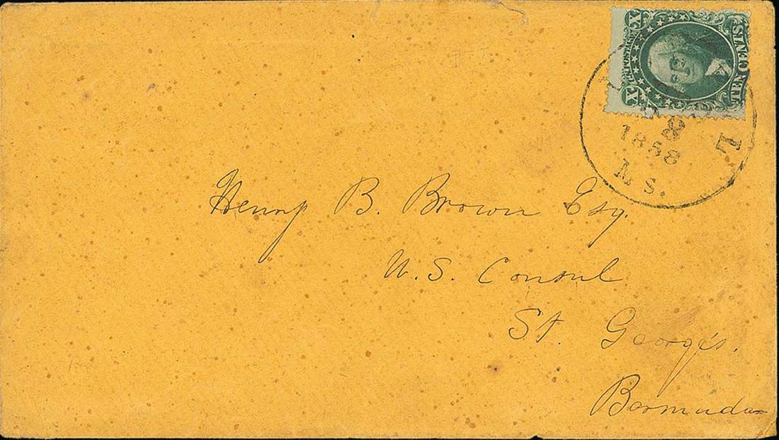1858 (28 Dec.) yellow envelope from Lowell, Massachusetts to Henry B. Brown, U.S. Consul at St. George's, to Boston per America to Boston and Halifax and thence per Delta to Bermuda, bearing 1857 10c. green neatly tied by datestamp; tone specks, otherwise fine. Photo