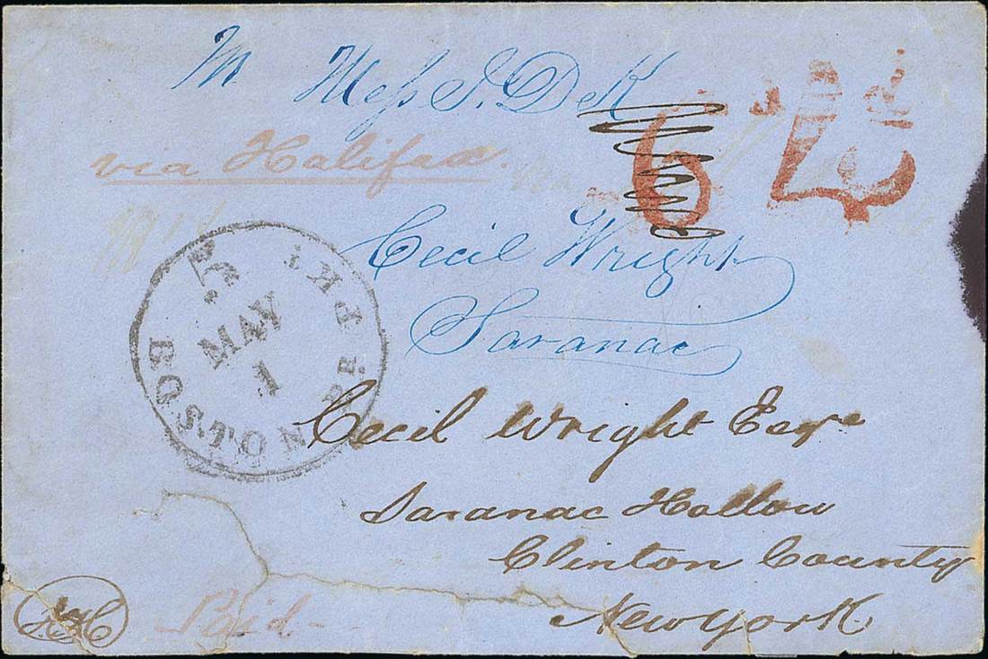 1861 (18 Apr.) blue envelope from Ireland Island to Saranac Hollow, Adirondack Mountains, New York, per Merlin to Halifax and per Arabia to Boston, showing Assistant Postmaster Daniel Grote's woodcut "6d" rate handstamp (R1) applied in error, assuming being addressed to the U.K., deleted and replaced with his "4d" handstamp (R1, very rare with only four strikes recorded), "5/boston br. pkt" datestamp at left, Ireland Island datestamp (PM5) on reverse; the envelope with faults at foot and blue recipients endorsements at top and all over reverse. The only known cover with two of the Daniel Grote rate handstamps. Photo